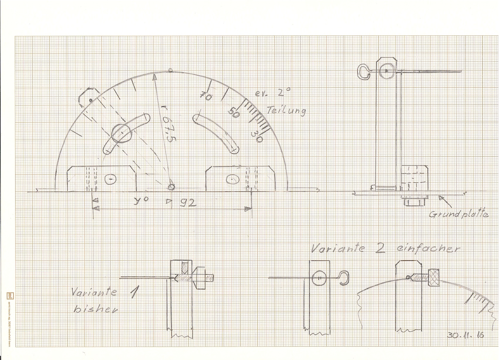 Nun hat eine Rechnung gezeigt, dass zwei Abstände verstellt werden müssen um die Uhr an einen anderen Breitengrad anzupassen. Herr Burgermeister hat sich bereit erklärt, die Uhr 2016 noch umzubauen, damit diese Anpassung elegant vorgenommen werden kann. Mittels der beiden halbkreisförmigen Scheiben lassen sich nun sowohl die Höhe des Ost-West-Drahtes als auch seine Distanz zum Mittelpunkt der Scheibe für einen beliebigen Breitengrad zwischen 30° und 70° einstellen. Die Höhe des Nord-Süd-Drahtes bleibt jetzt fest, sie ist identisch mit der Höhe des anderen Drahtes in ganz aufgerichteter Stellung.