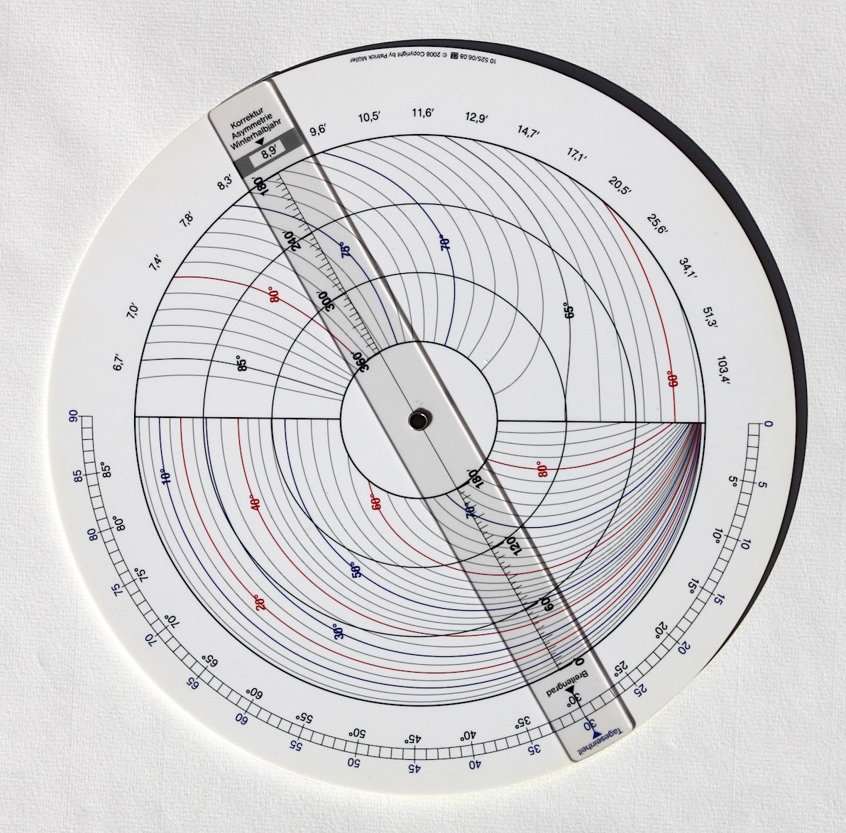 Wenige Tage nachdem ich die Arbeiten an meiner grossen Webseite zur Relativitätstheorie zu einem vorläufigen Abschluss gebracht hatte ist Herr Mueller mit dem Wunsch aufgekreuzt eine Rechenscheibe zu entwickeln, welche es erlaubt, den Zeitpunkt des Sonnenaufgangs und des Untergangs für einen beliebigen Ort auf dem Planeten und einen beliebigen Tag im Jahr auf Minuten genau zu berechnen. Dieser Wunsch nach einer analogen Lösung in den Zeiten von Internet und Mobiltelefon hatte etwas exzentrisches, aber genau das hat mich gereizt, mich mit der Fragestellung zu befassen.