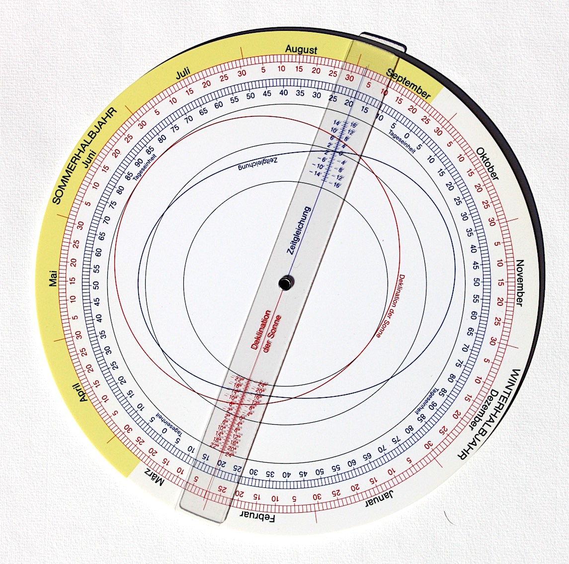 Wenige Tage nachdem ich die Arbeiten an meiner grossen Webseite zur Relativitätstheorie zu einem vorläufigen Abschluss gebracht hatte ist Herr Mueller mit dem Wunsch aufgekreuzt eine Rechenscheibe zu entwickeln, welche es erlaubt, den Zeitpunkt des Sonnenaufgangs und des Untergangs für einen beliebigen Ort auf dem Planeten und einen beliebigen Tag im Jahr auf Minuten genau zu berechnen. Dieser Wunsch nach einer analogen Lösung in den Zeiten von Internet und Mobiltelefon hatte etwas exzentrisches, aber genau das hat mich gereizt, mich mit der Fragestellung zu befassen.